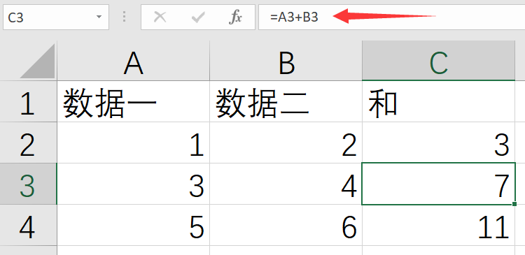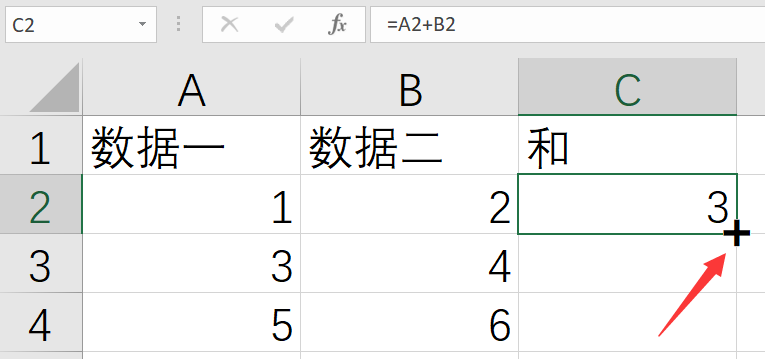 接下来需要在C列中显示每行中数据一和数据二相加的和。首先选中C2单元格,输入公式“=A2+B2”并回车(ENTER)确认,此时C2单元格会显示计算结果3,如下图所示。