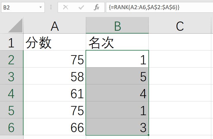 下面使用数组公式、绝对地址和RANK()函数实现数据的排名,首先选中B2:B6区域,然后在编辑栏中输入公式“=RANK(A2:A6,$A$2:$A$6)”,接下来使用键盘Ctrl+Shift+Enter组合键确定公式的输入,此时,公式会变为“{=RANK(A2:A6,$A$2:$A$6)}”,这时称为数组公式,其输入和输出结果都有多个数据。确定公式后可以看到分数已经从高到低进行了排名,如下图所示。
