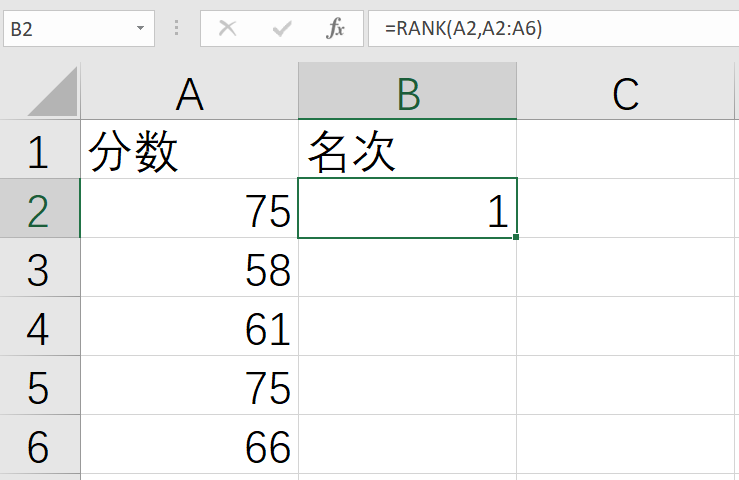 如果只希望计算第一个分数的排名,也可以在普通公式中使用RANK()函数。首先选中B2单元格,输入公式“=RANK(A2,A2:A6)”,然后回车(Enter)确认,此时B2单元格会显示1,即排名第一,结果如下图所示。