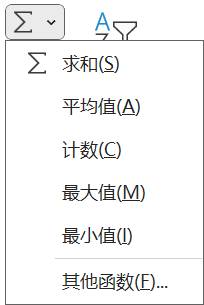 在“开始”选项卡>>“编辑”组中直接点击“Σ”图标可以添加求和函数,通过按钮的下拉菜单还可以选择平均值、计数、最大值、最小值等函数,如下图所示。