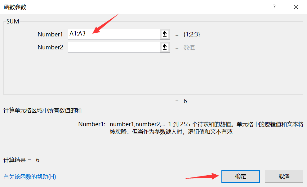 在“函数参数”窗口中,上方的方框标题为函数名,这里是SUM。SUM框内是可以设置的函数参数;方框的下方是当前参数的说明。图中,Number1参数默认选中了A1:A3区域,Number2参数为空;窗口下方显示了计算结果为6。实际应用中,如果自动选中的参数有误,可以直接在参数框里输入,也可以点击参数框后的“上箭头和横线”图标,然后通过鼠标拖拽选择单元格或区域,选择再次点击此图标确认。函数及参数确认无误后,点击右下角的“确定”按钮完成参数的插入操作。
