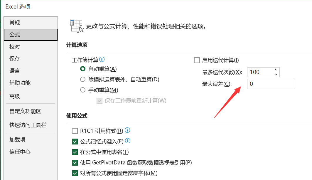 可以看到计算还是有一些误差,此时可以通过修改设置参数提高计算精度,通过“文件”选项卡打开“选项”窗口,在“公式”页中将“最大误差”修改为0,如下图。