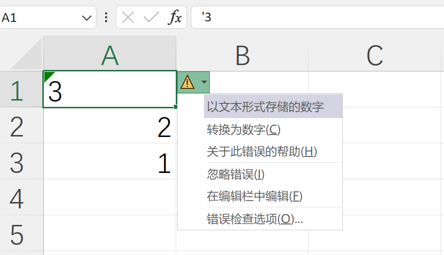 实际上,A1单元格中只有数字,如果使用SUM(A1:A3)函数计算A1到A3单元格数据的和时,依然可以得到6,即单元格内是纯数字时是可以进行计算的。在单元格中输入内容时,如果需要确保输入的内容作为文本处理,内容可以使用英文单引号开始,如将数字3作为文本,可以输入“'3”,回车后可以看到单元格的左上角有一个绿色的小三角,此时会有提示,遇到这种情况时可以根据实际需要进行处理,如下图所示。