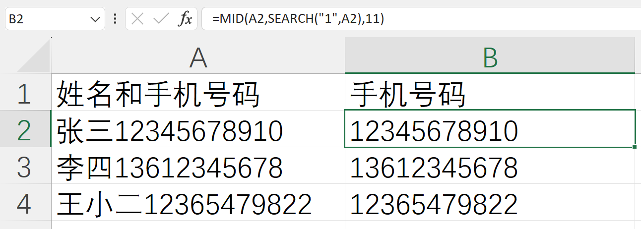本例相对简单,第一步使用SEARCH()函数获取1开始的位置,然后使用MID()函数从此位置截取11位字符。B2单元格的公式用于截取A2单元格中的手机号码,公式为“=MID(A2,SEARCH("1",A2),11)”,B3和B4单元格的公式可以通过公式复制得到。