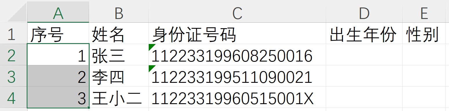 首先来完成序号的填充,我们在A2单元格输入数字1,并保持A2单元格选中状态;然后按住Ctrl键,将鼠标光标移动到A2单元格边框右下角,当光标变成加粗十字图标时,按住鼠标左健向下拖拽,则A3、A4单元格会自动生成序号2和3,结果如下图。