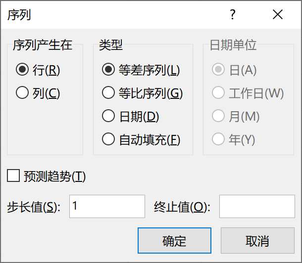 如果数据行较多,通过拖拽的方式生成序号可能不太方便,此时可以使用序列填充。首先删除A3和A4单元格的数据,可以选中它们并使用键盘Delete键删除数据。接下来保持A2单元格的数字1,并选中从A2开始的所有需要填充序号的单元格,本例为A2到A4单元格,然后通过“开始”选项卡>>“编辑”组>>“填充”>>“序列”打开序列设置窗口,如下图所示。