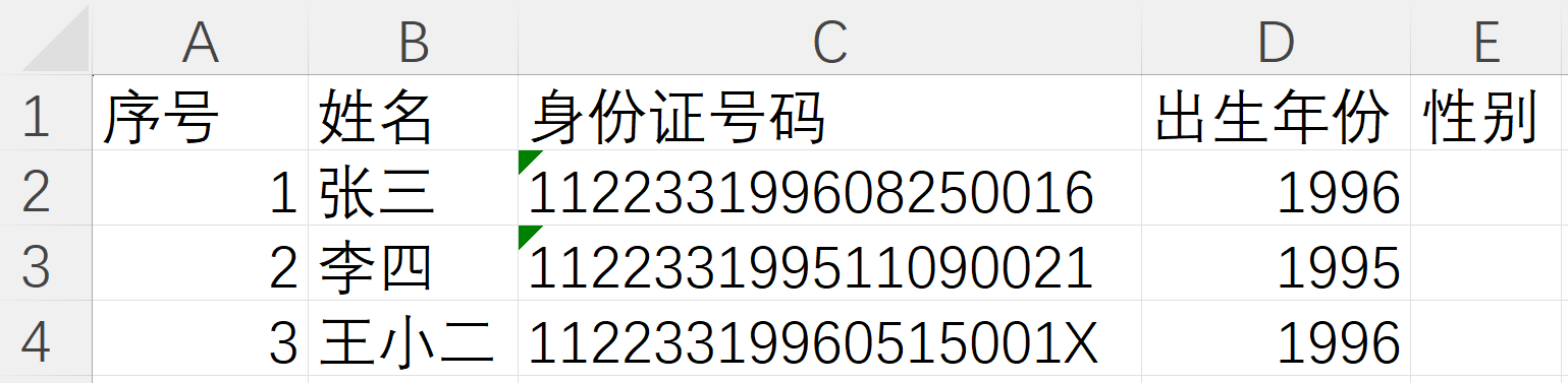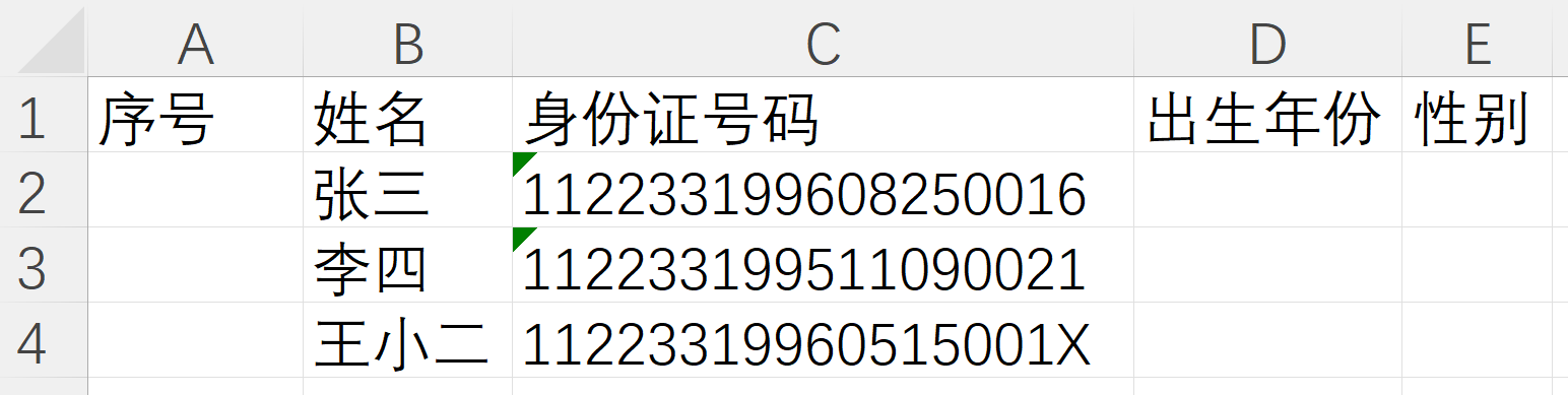 处理18位身份证号码、银行卡号、统一社会信用代码等可能大于15位数字的数据时要特别注意15数字限制问题,比如,直接输入18位身份证号码时,如果最后一位不是X,后3位会变成0,这样就不是正确的身份证号码了。
