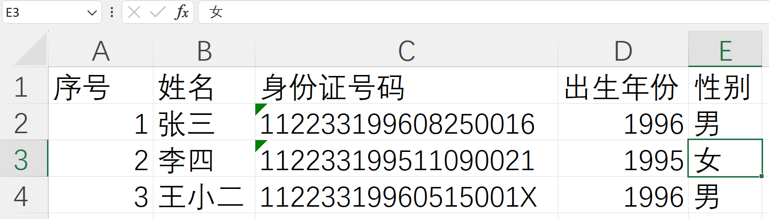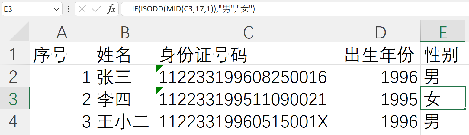 最后是确认人员的性别,首先在E2单元格通过公式“=IF(ISODD(MID(C2,17,1)),"男","女")”显示张三的性别;然后可以通过复制公式的方式生成其它人员的性别信息;保持E2单元格的选中状态,将鼠标光标移动到单元格边框的右下角,当光标变成加粗十字图标时双击鼠标左键或按住鼠标左键向下拖拽即可以完成公式复制,操作完成后结果如下图所示,请注意图中编辑栏中显示了李四的性别提取公式。