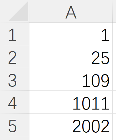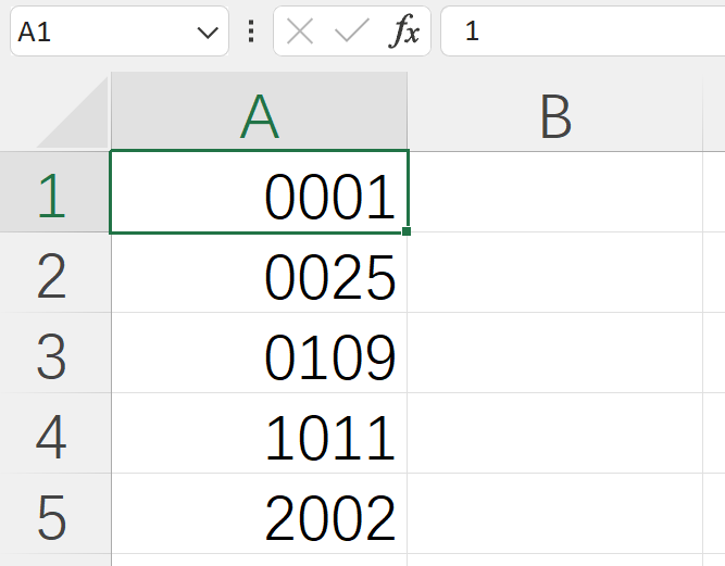 前导0一般是作为占位符使用,如编号必须有4位,则小于1000的数字在高位就可以使用0填充。处理前导0时也需要注意,如果内容必须真正包含前导0,可以在输入数据时使用英文单引号开始或者将单元格格式设置为“文本”。只需要显示为有前导0的格式时,可通过设置单元格格式实现,假如A列有如下图所示的数据。