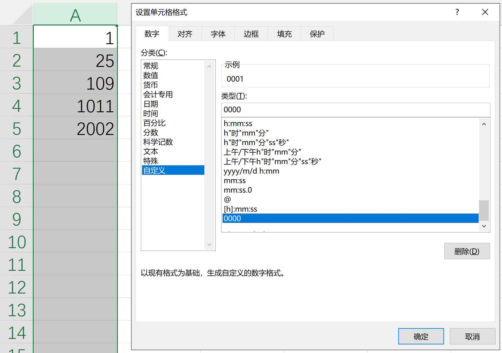 我们可以选中A列,然后打开设置单元格格式窗口,在“数字”页“自定义”项中的“类型”栏中输入四个0,即“0000”,如下图所示。