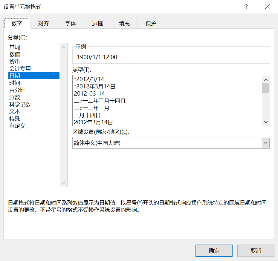 单元格中显示日期和时间时,可以通过设置单元格格式窗口“数字”页中的“日期”、“时间”或“自定义”项进行设置,如下图显示的就是“日期”的选项。