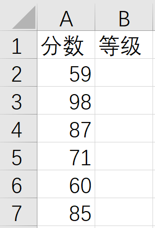 下面使用IFS()函数来对分数进行分级,假如A列有如下图所示的分数。