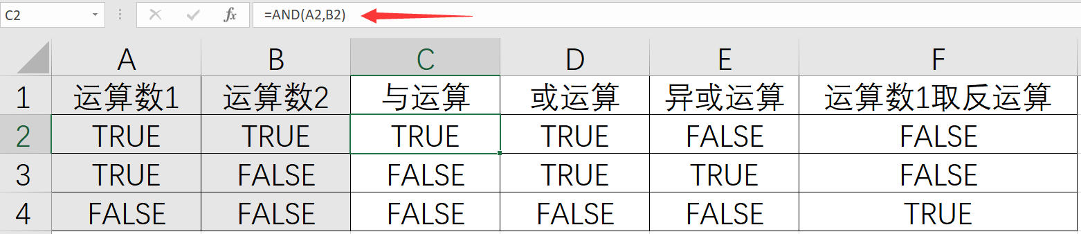 下图中给出的这四种逻辑运算的运算规则,编辑栏显示了与运算AND()函数的使用方法,即A2和B2单元格的数据进行与运算,公式为“=AND(A2,B2)”。