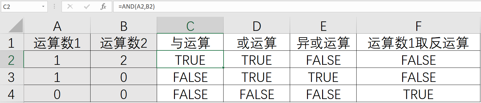 请注意1和2的异或运算,1和2进行逻辑运算前都会自动转换为逻辑型,它们都会当作TRUE值来运算,所以异或运算结果为FALSE值。一些函数中的参数需要逻辑型数据,实际应用中可以使用0和1简化参数输入,函数也可以正常工作。