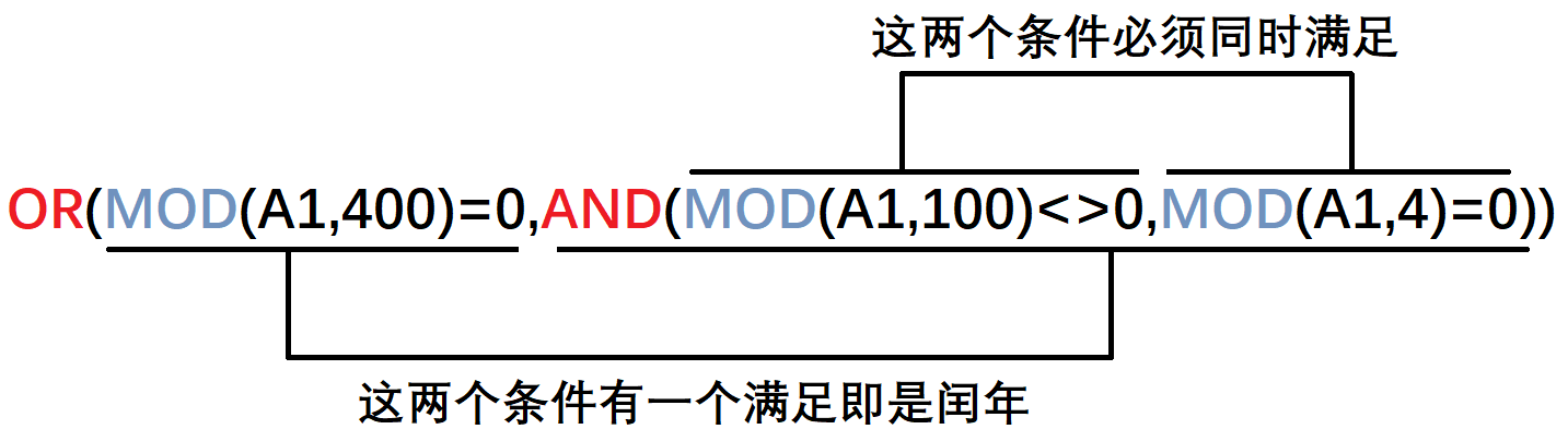 如图中所示,某个年份是闰年时有两种情况,只要满足其中一个条件就是闰年,这两个条件使用最外层的OR()函数来确定,第一个条件是年份能被400整除即是闰年,如2000是闰年,而1900和2100年不是闰年,这里使用MOD()函数计算年份除以400的余数。第二个条件是一个复合条件,需要同时满足时才是闰年,使用AND()函数确定,其中条件一是年份不能被100整除,即年份除以100的余数不是0,条件二是年份能够被4整除。