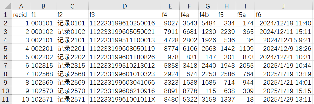 操作完成后,Excel2021会使用新的工作表显示导入的数据,如下图显示了导入的列名和前10行数据。