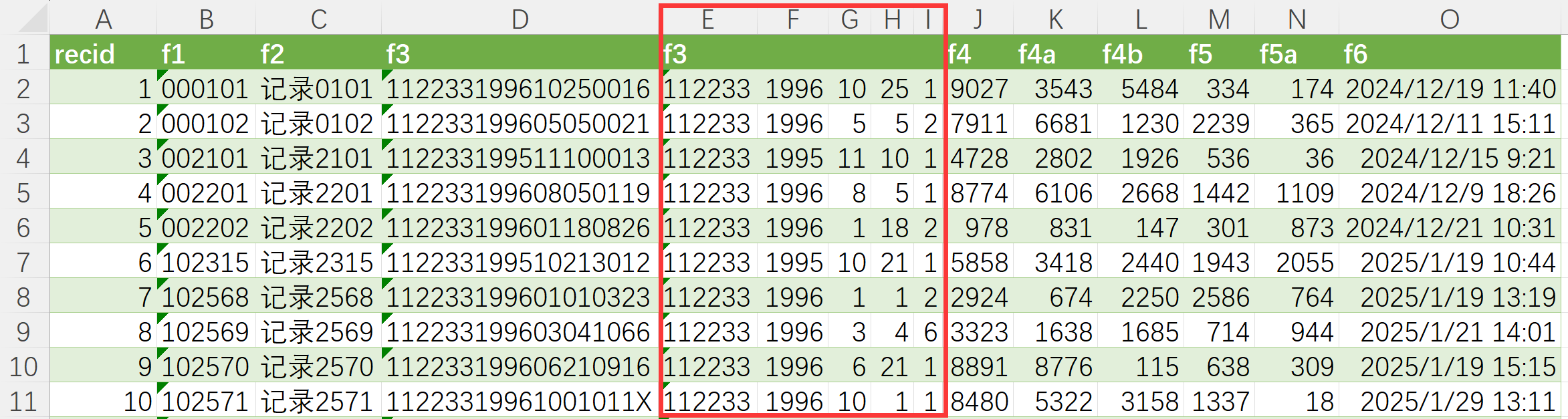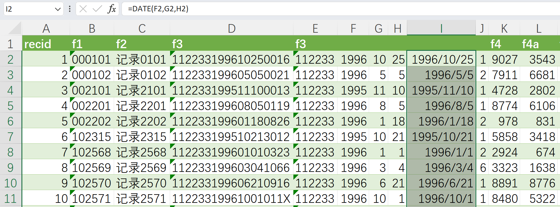 从原始数据中提取所需要的数据后,还可以进一步完善其格式,接下来就将生日的年、月、日信息组合为日期型数据,我们使用上述数据继续操作。在提取的年、月、日后添加新列,然后在新列的第2行,即recid为1的行添加公式“=DATE(F2,G2,H2)”,然后向下复制公式完成日期的组合工作,如下图所示。