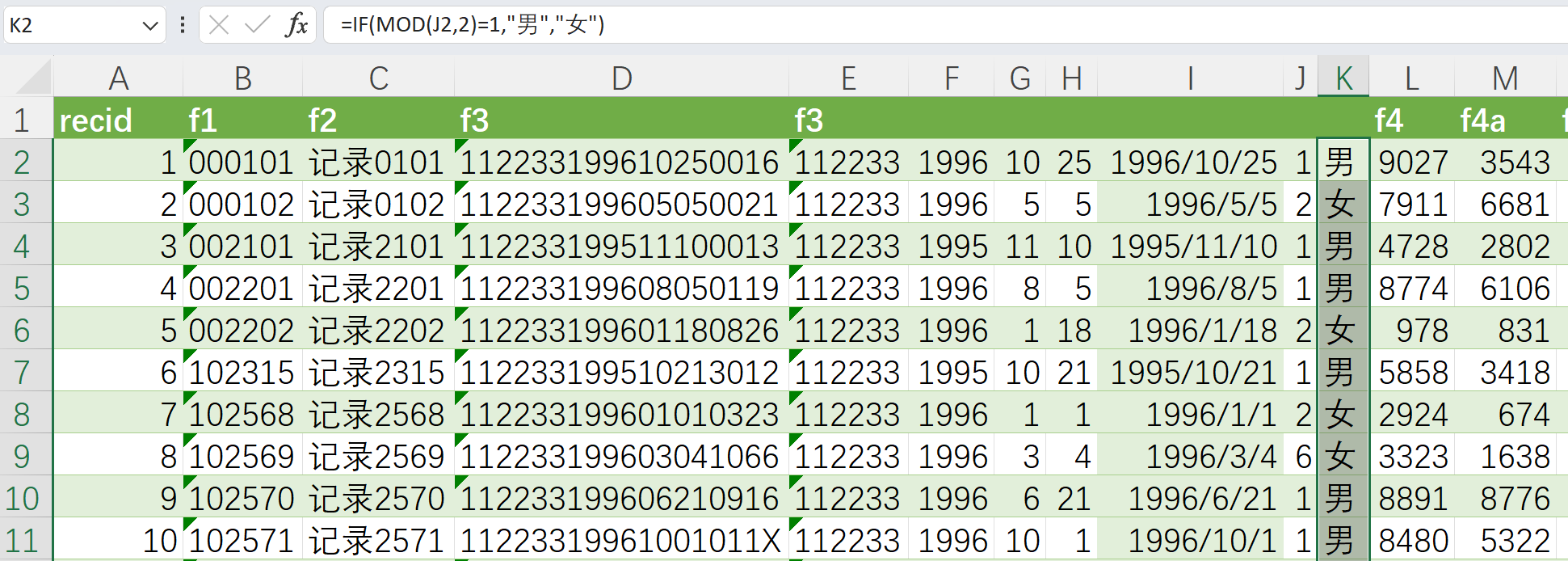 接下使用“男”和“女”表示性别,在表示性别的数字列后添加新列,然后在新列第2行添加公式“=IF(MOD(J2,2)=1,"男","女")”,然后向下复制公式完成性别数据的填充,结果如下图所示。