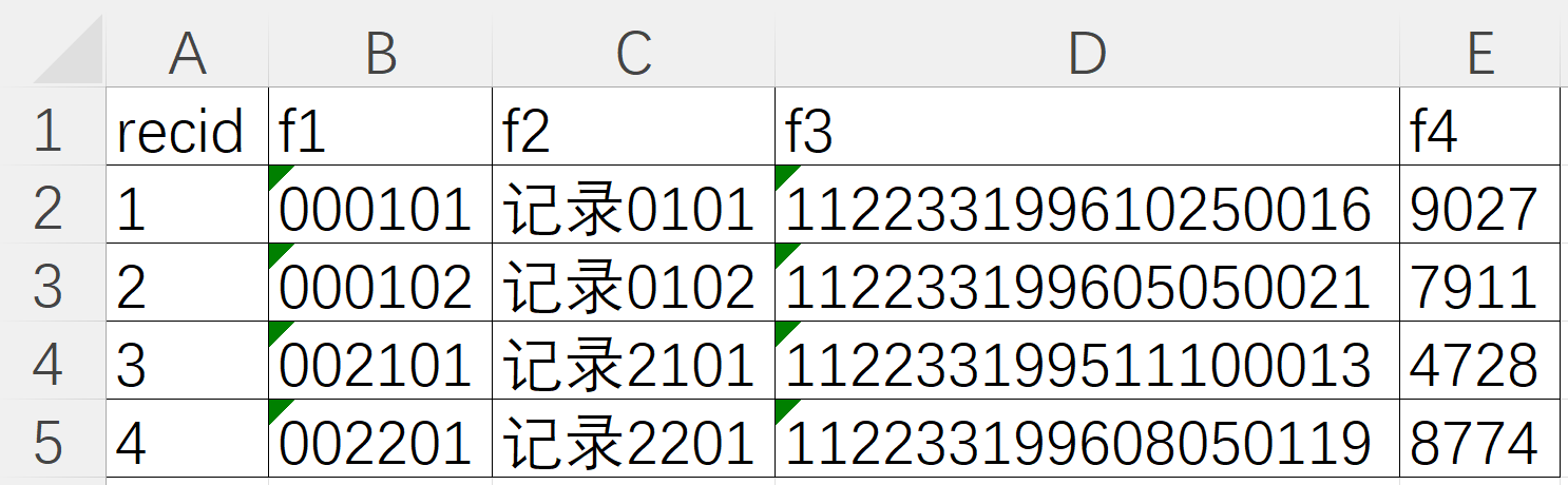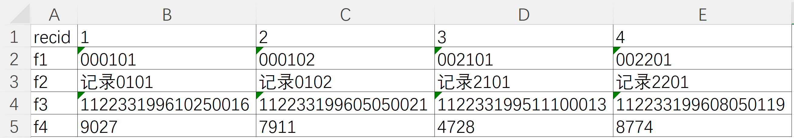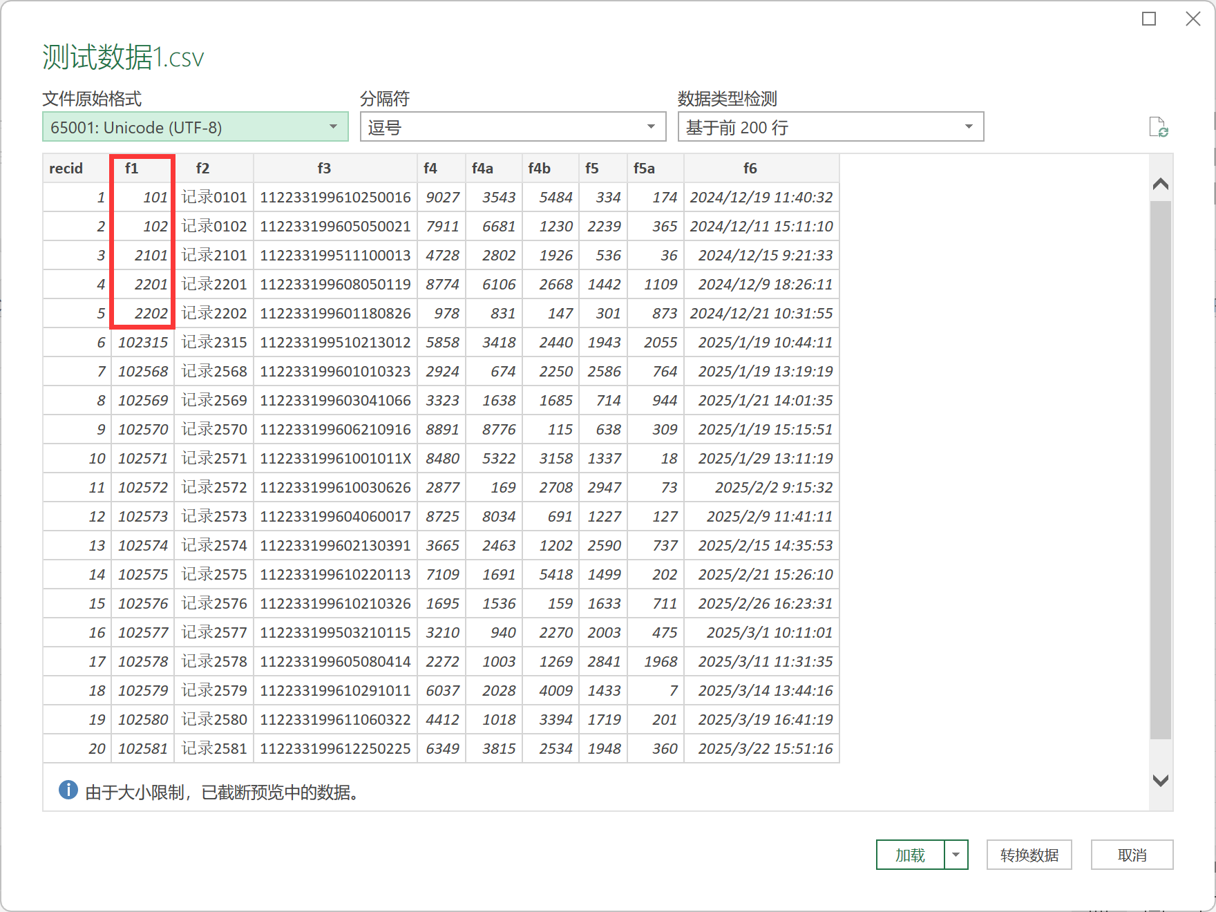 如上图所示,除f1列的其它列的数据格式都可以正常识别,而f1列中有前导0的几个数据识别出现了问题,这里自动识别为数字而删除了前导0;实际上,可以看出f1中是某种编号,其中是有使用0开始的,此时不能直接加载,而是要点击“转换数据”按钮进行一些数据格式设置。