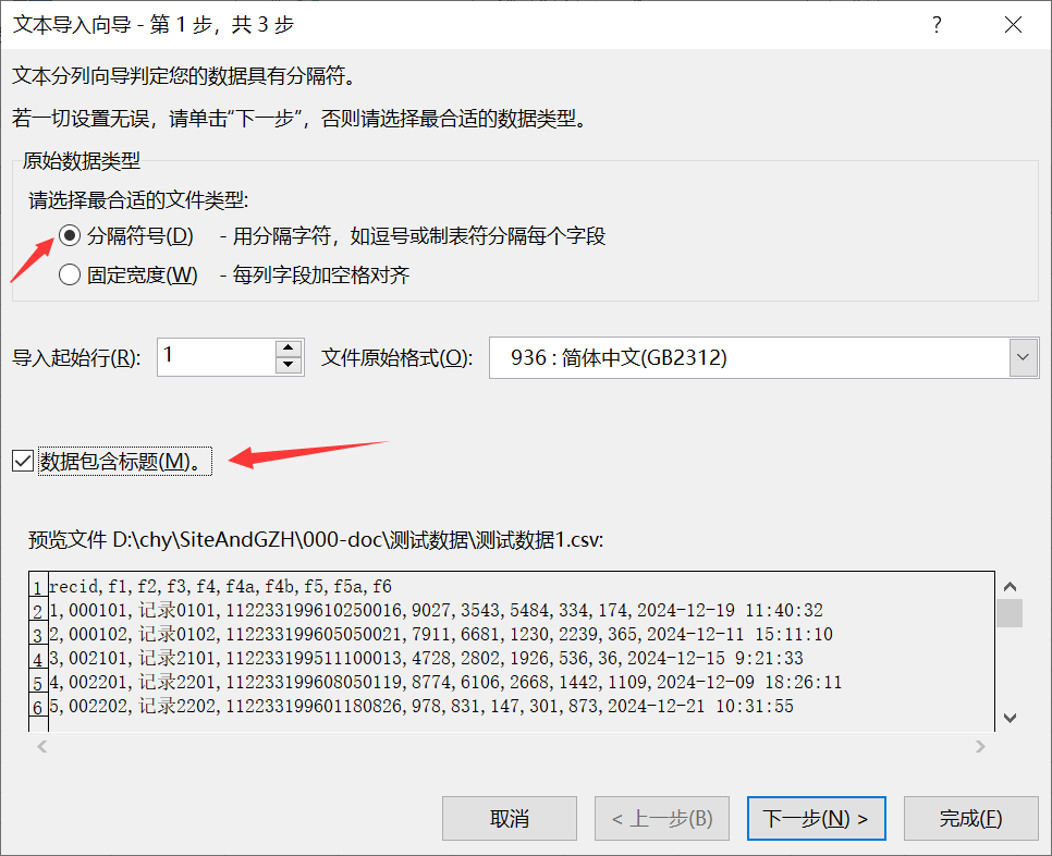 这里根据实际数据格式进行选择,如本例使用逗号分隔每一列的数据,并且第一行是包含了指标名称的标题行;然后点击“下一步”按钮,如下图所示。