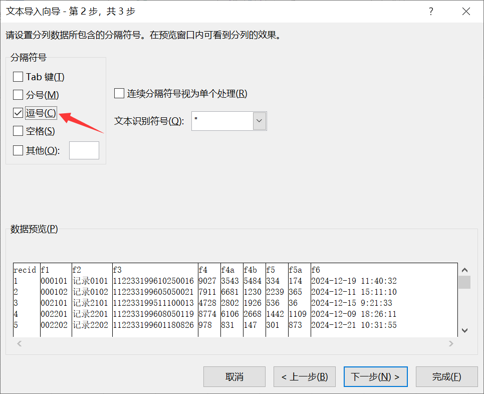 此步骤中需要选择正确的列数据分隔符,本例为逗号,然后点击“下一步”继续。