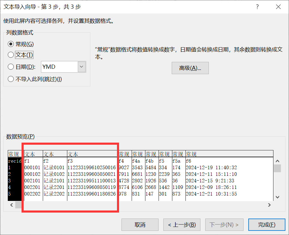 数据预览中,在6个字符后、10个字符后、12个字符后、14个字符后、16个字符后、17个字符后的位置点击鼠标左键确定分隔位置,如上图所示。然后点击“下一步”按钮可以进一步设置各列的数据类型,如下图所示。