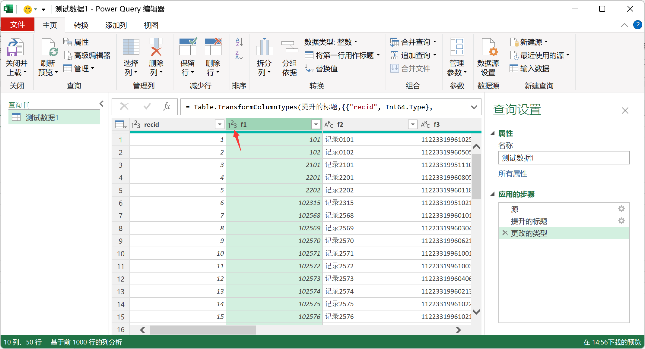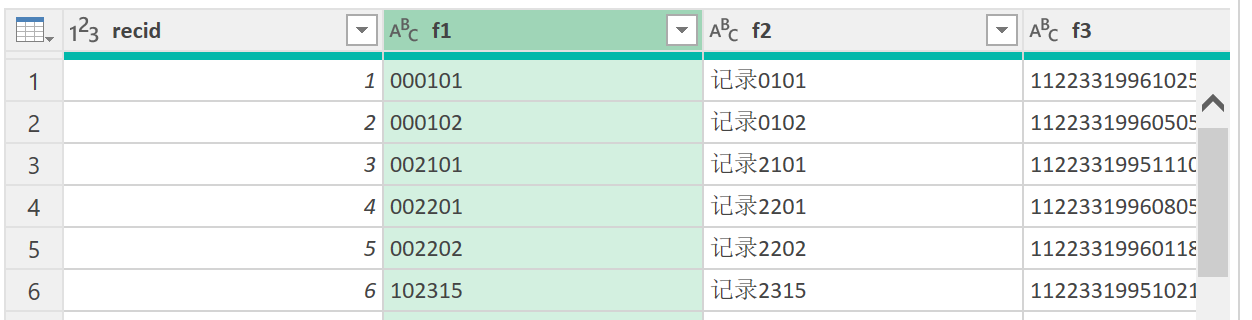 接下来要做的就是确认每一列的数据类型,如上图箭头所指的位置,可以看到f1列识别为数值类型,显示为123图标,而f2、f3列识别为文本类型,显示为ABC图标。点击f1列的123图标,然后在列表中选择“ABC文本”;由于是初次导入数据并且f1列确实是文本类型,所以在弹出的窗口中直接选择“替换当前转换”即可。操作后可以看到f1列数据中的前导0已正确显示,如下图所示。