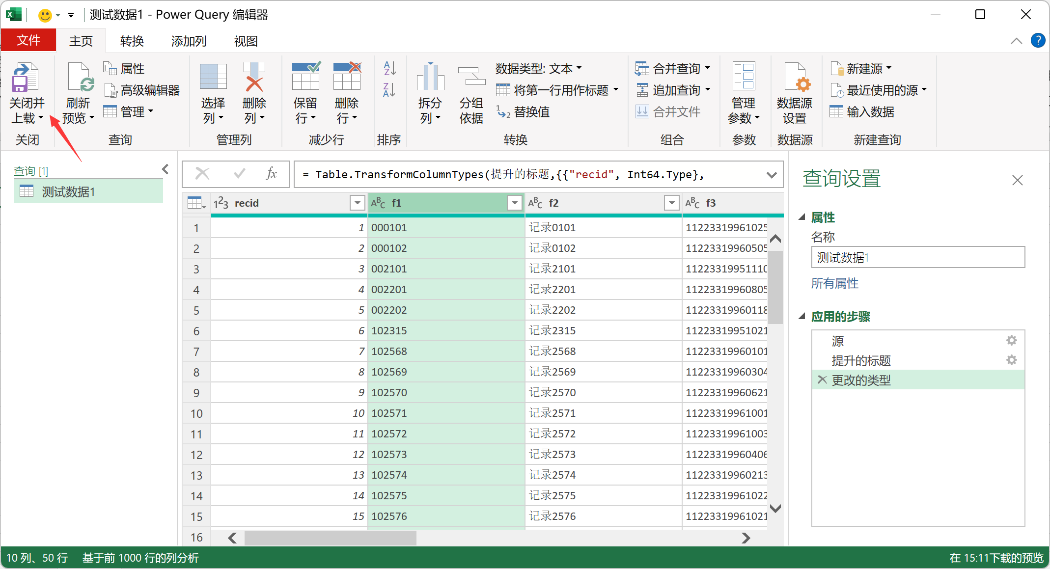 确认所有列的数据类型无误后,可以点击PowerQuery窗口的“主页”选项卡>>“关闭”组中的“关闭并上载”按钮,如下图所示。
