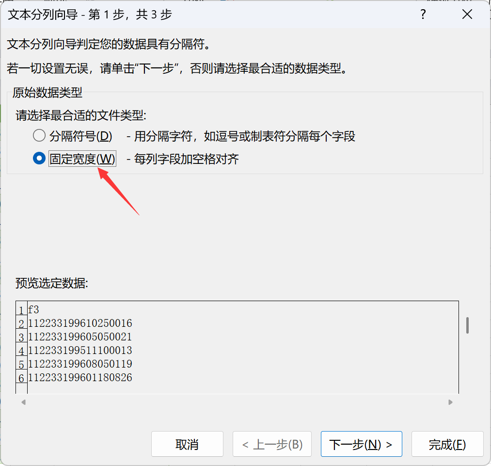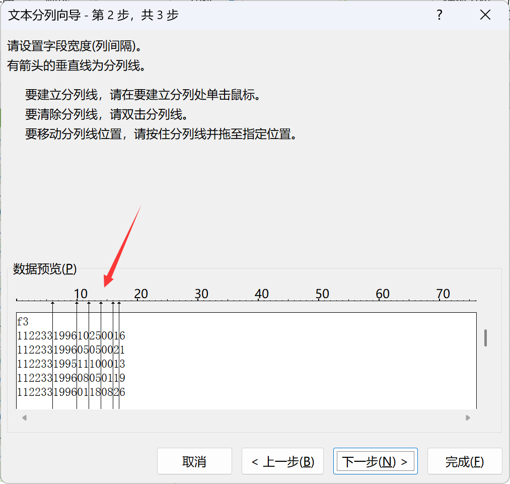 提取的新数据共5列,需要在f3列后提前插入5个空白列来保存数据,选中f4列,然后通过鼠标右键菜单“插入”项添加5列。此外,分列产生的数据会替换原来的数据,如果需要继续保留身份证号码,可以将身份证号码列复制一份,本文示例中就复制了一列新的身份证号码进行操作,如选中f3列并复制(Ctrl+C),然后使用鼠标右键菜单,选择“插入复制的单元格”。接下来选中后一个包含身份证号码的列,然后点击“数据”选项卡>>“数据工具”组>>”分列”按钮打开分列操作向导;由于身份证号码没有分隔符,在这里选择“固定宽度”,如下图所示。