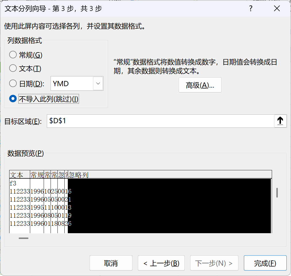 这一步骤中,将前6位,即区划代码部分设置为文本格式;生日的年、月、日保存常规格式;15和16、18位字符选择“不导入此列”,数据预览中显示为“忽略列”;最后点击“完成”,这样就将区域代码、生日年、月、日,以及表示性别的第17位字符提取为单独的列,如下图所示。