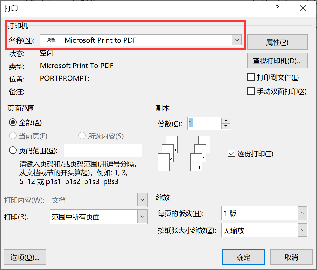 随后会出现打印窗口,需要打印纸质成绩单可以直接选择指定的打印机打印,如果需要生成PDF格式,可以在打印机列表中选择“Microsoft Print to PDF”,如下图所示。