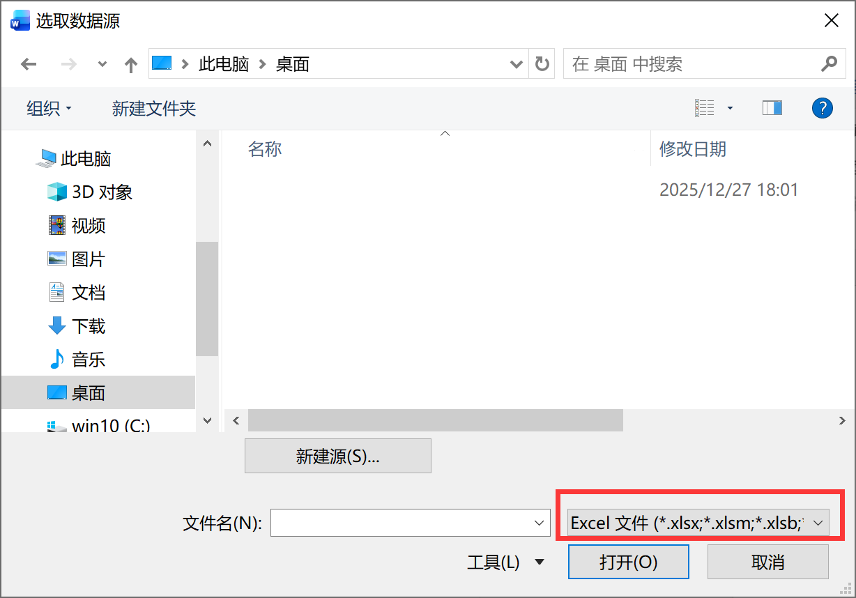 在Word中点击“邮件”选项卡>>“开始邮件合并”组>>“选择收件人”,并在菜单中选择“使用现有列表”,在弹出的窗口中选择包含数据的Excel文件,如下图所示。