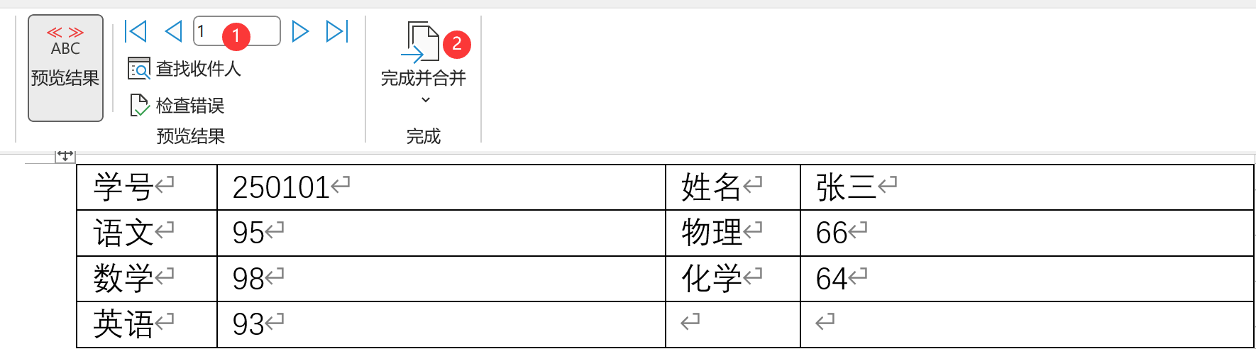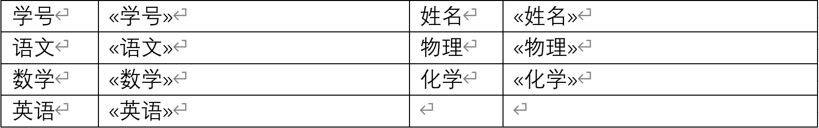 下面来看一个简单的示例,我们使用Word邮件合并功能生成学生成绩单,学生信息和分数如下图所示。
