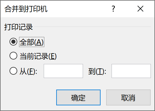如图位置①所示,可以通过导航按钮浏览所有数据。确认没有问题以后可以打印所有的成绩单,点击上图位置②的“完成并合并”>>“打印文档”,在窗口中选中“全部”,如下图所示。