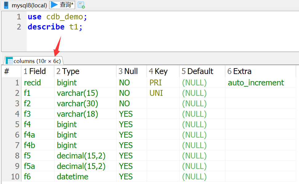 查询cdb_demo数据库中t1表的字段信息可以使用如下代码。