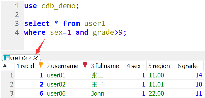 use cdb_demo; select * from user1 where sex=1 and grade>9;