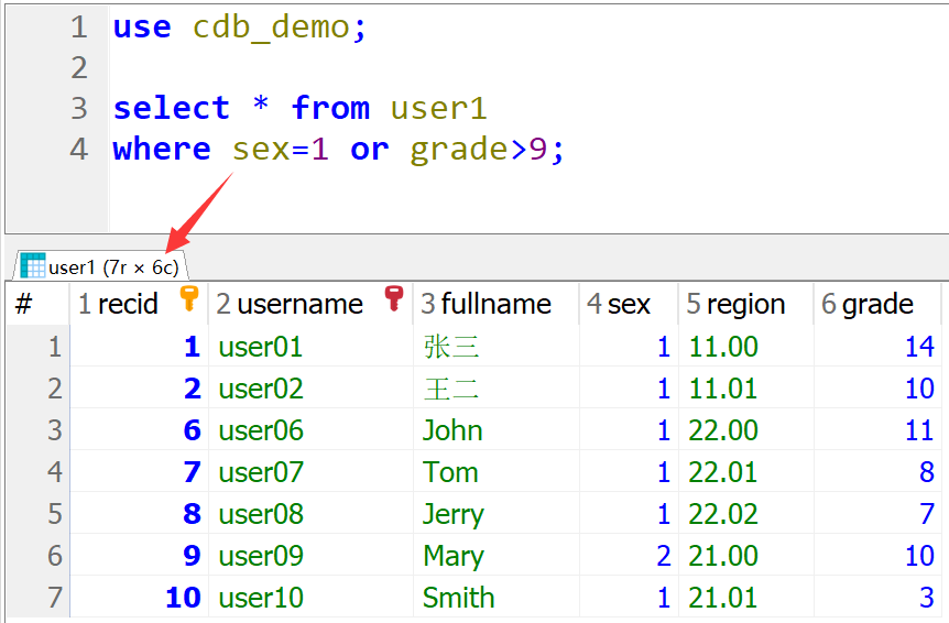 use cdb_demo; select * from user1 where sex=1 or grade>9;