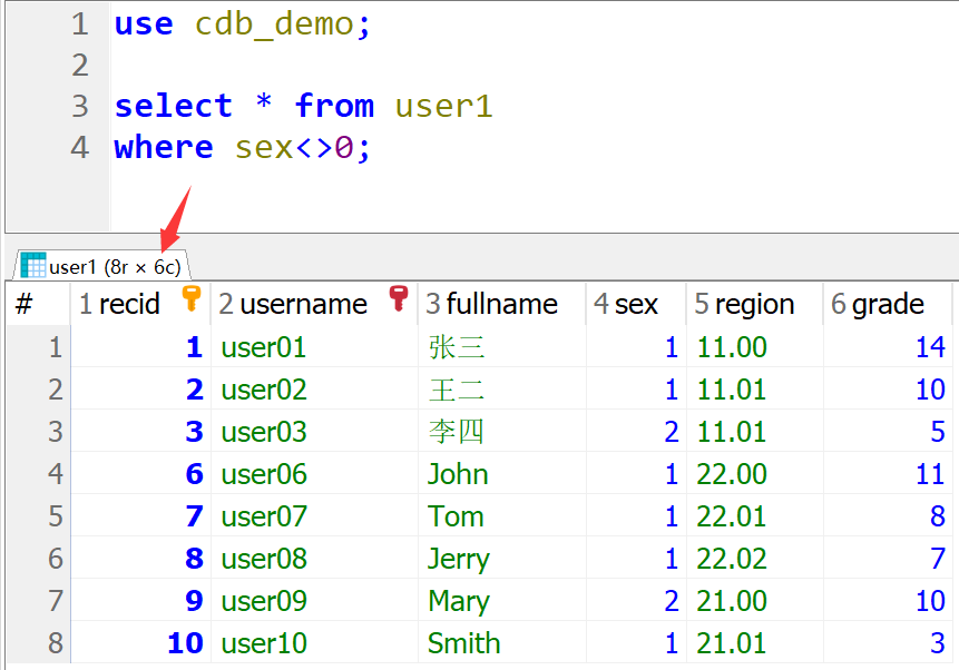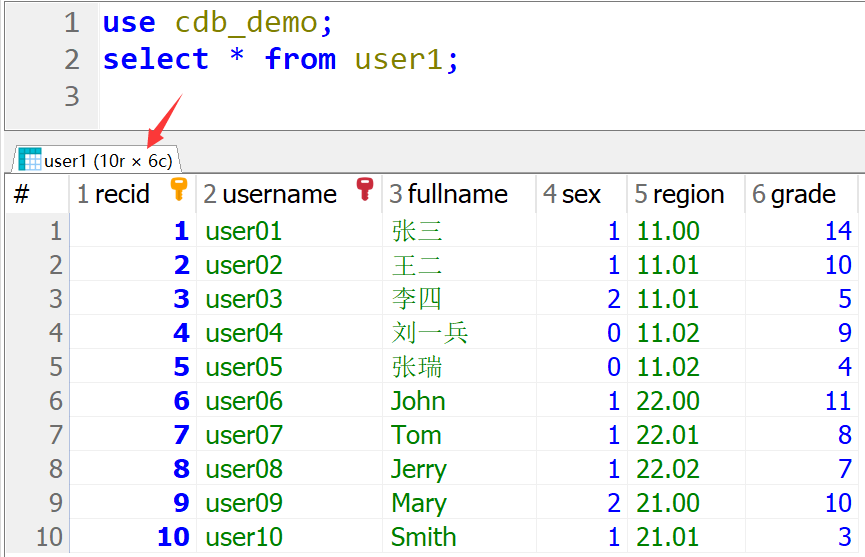 use cdb_demo; -- 创建用户表 create table user1( recid bigint not null auto_increment primary key, username varchar(30) not null unique, fullname varchar(30), sex int not null default 0, region varchar(30), grade int )engine=innodb default charset=utf8mb4; -- 添加用户数据 insert into user1(username,fullname,sex,region,grade) values('user01','张三',1,'11.00',14), ('user02','王二',1,'11.01',10), ('user03','李四',2,'11.01',5), ('user04','刘一兵',0,'11.02',9), ('user05','张瑞',0,'11.02',4), ('user06','John',1,'22.00',11), ('user07','Tom',1,'22.01',8), ('user08','Jerry',1,'22.02',7), ('user09','Mary',2,'21.00',10), ('user10','Smith',1,'21.01',3);