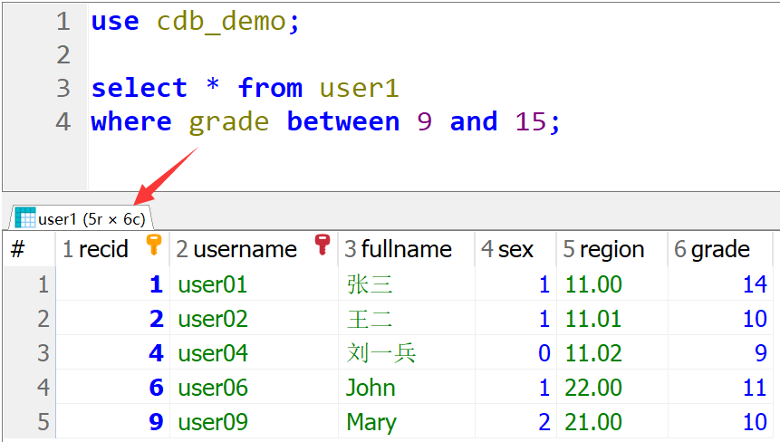 use cdb_demo; select * from user1 where grade between 9 and 15;