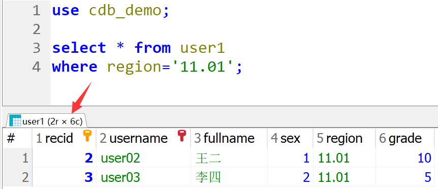 use cdb_demo; select * from user1 where region='11.01';
