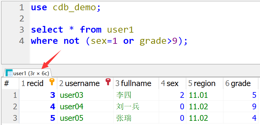 use cdb_demo; select * from user1 where not (sex=1 or grade>9);