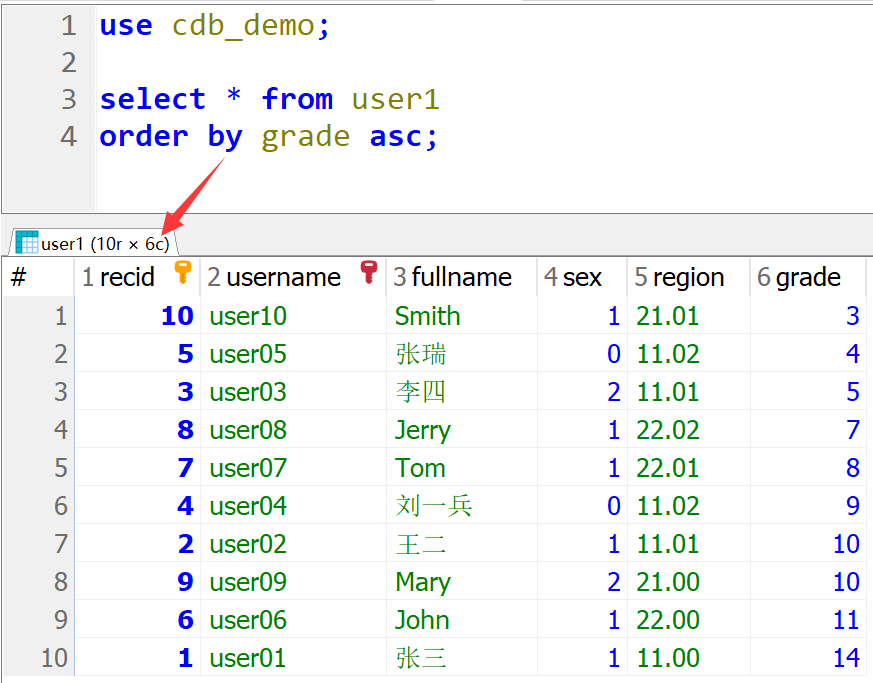 use cdb_demo; select * from user1 order by grade asc;