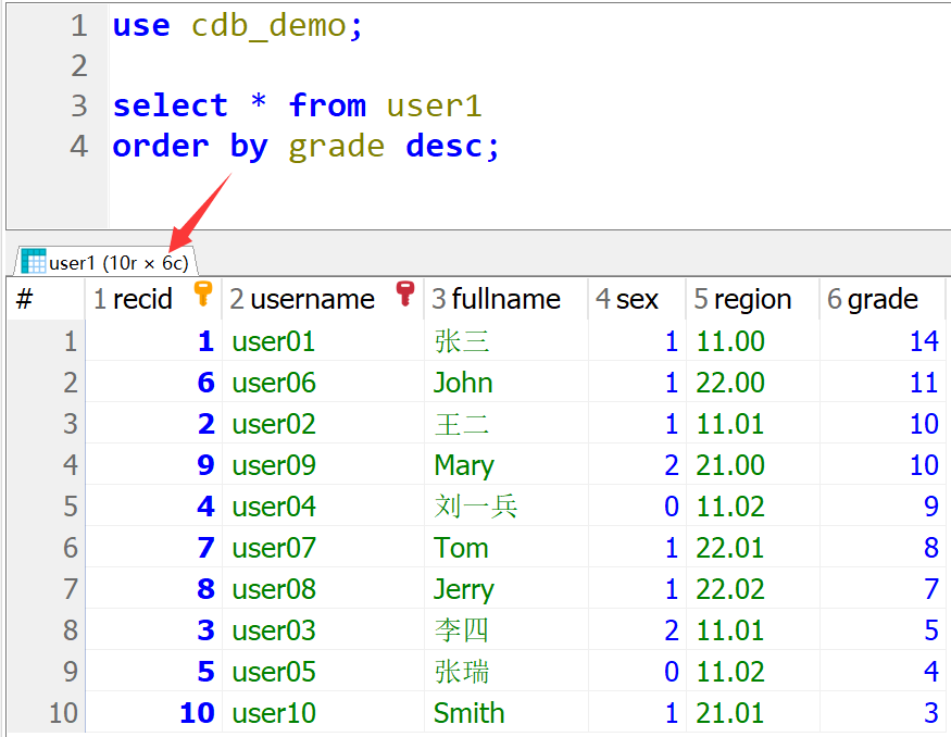 use cdb_demo; select * from user1 order by grade desc;