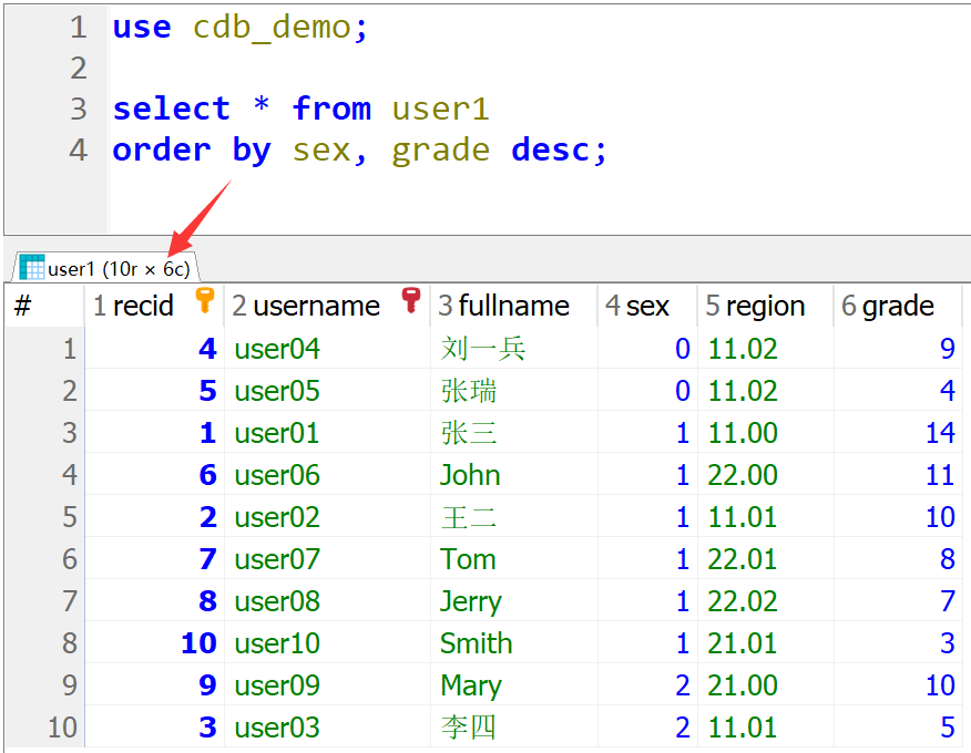 use cdb_demo; select * from user1 order by sex, grade desc;
