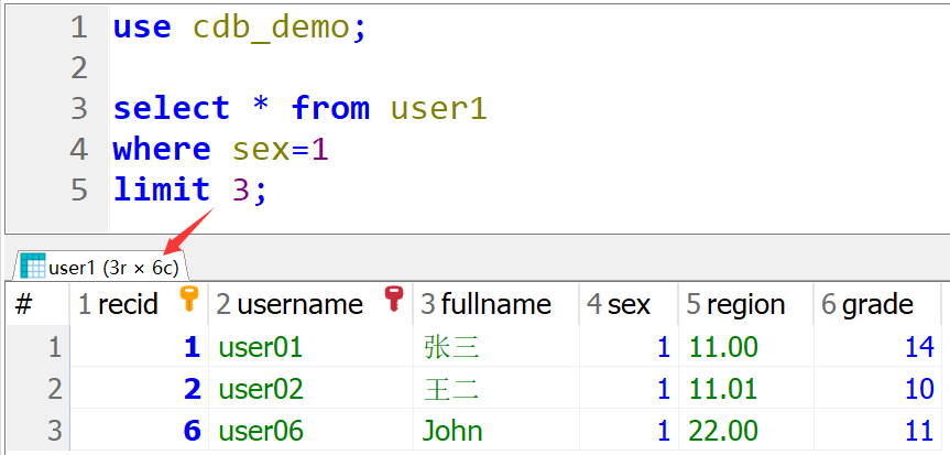use cdb_demo; select * from user1 where sex=1 limit 3;
