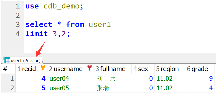 use cdb_demo; select * from user1 limit 3,2;