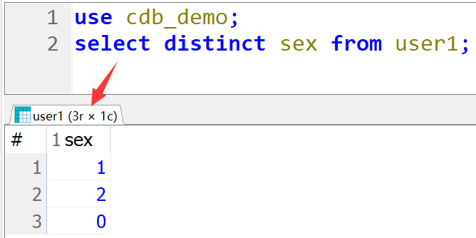 use cdb_demo; select distinct sex from user1;