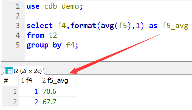 use cdb_demo; select f4,format(avg(f5),1) as f5_avg from t2 group by f4;