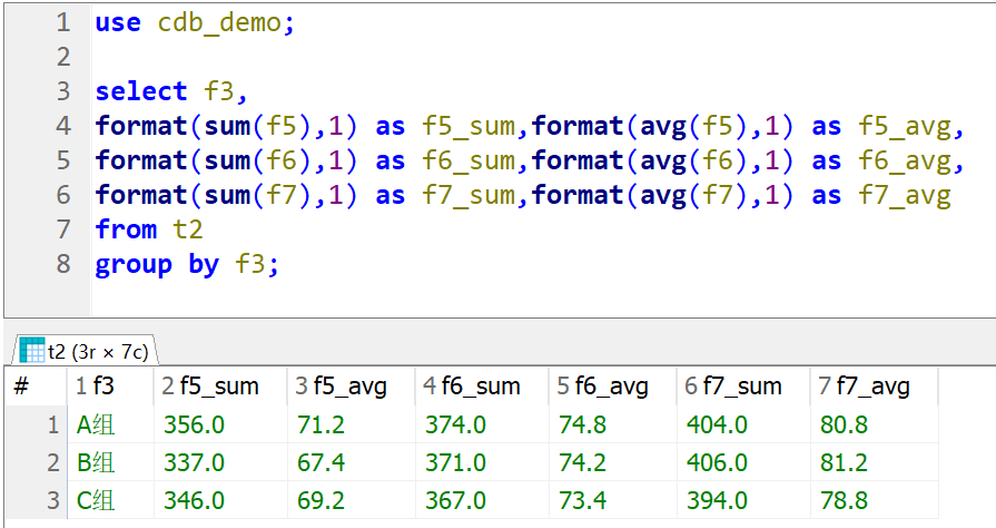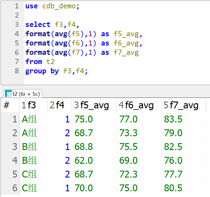 use cdb_demo; select f3,f4, format(avg(f5),1) as f5_avg, format(avg(f6),1) as f6_avg, format(avg(f7),1) as f7_avg from t2 group by f3,f4;
