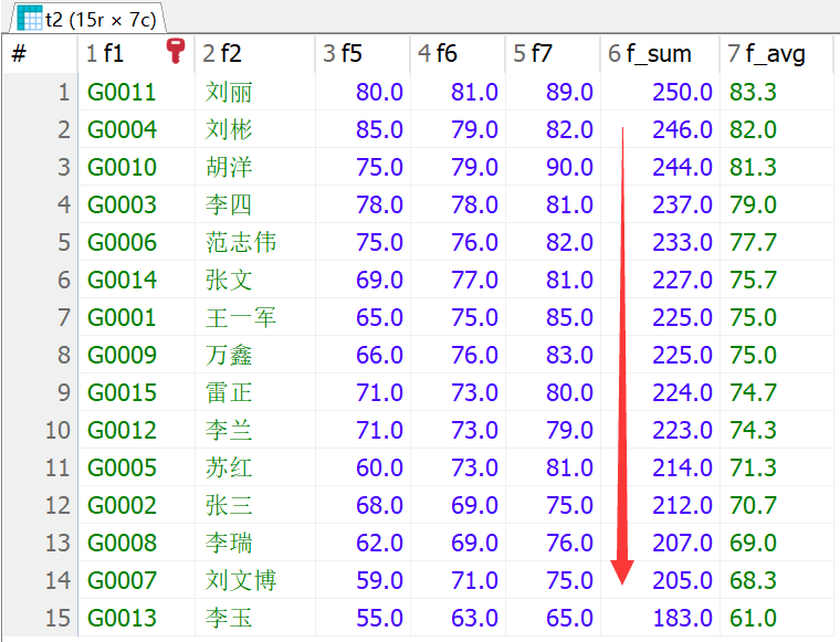 本例,首先会直接显示f1、f2,f5、f6、f7字段数据;然后通过f5、f6、f7字段数据求和得出每位同学的总分,并将数据列命名为f_sum;最后使用f5、f6、f7的和除以3得到三门功课的平均分,结果保留1位小数,并将数据列命名为f_avg。代码执行结果如下图所示。